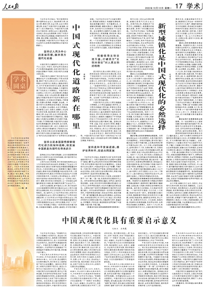 習(xí)近平總書記在省部級(jí)主要領(lǐng)導(dǎo)干部專題研討班上發(fā)表重要講話指出:“在新中國(guó)成立特別是改革開放以來的長(zhǎng)期探索和實(shí)踐基礎(chǔ)上,經(jīng)過黨的十八大以來在理論和實(shí)踐上的創(chuàng)新突破,我們成功推進(jìn)和拓展了中國(guó)式現(xiàn)代化”“我們推進(jìn)的現(xiàn)代化,是中國(guó)共產(chǎn)黨領(lǐng)導(dǎo)的社會(huì)主義現(xiàn)代化,必須堅(jiān)持以中國(guó)式現(xiàn)代化推進(jìn)中華民族偉大復(fù)興”。習(xí)近平總書記的重要論述,為學(xué)術(shù)界深化中國(guó)式現(xiàn)代化理論研究指明了方向、提出了重大課題。中國(guó)式現(xiàn)代化道路新在哪里,能夠帶來哪些啟示?怎樣認(rèn)識(shí)新型城鎮(zhèn)化和中國(guó)式現(xiàn)代化的關(guān)系?本期學(xué)術(shù)版圍繞這些問題進(jìn)行闡述。